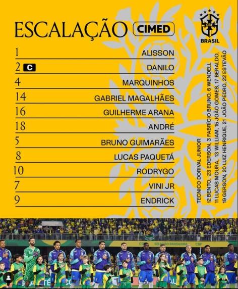 巴西首发:1-阿利森、4-马尔基尼奥斯、14-加布里埃尔、16-阿拉纳、2-达尼洛、5-吉马良斯、18-安德烈、8-帕奎塔、7-维尼修斯、10-罗德里戈、9-恩德里克